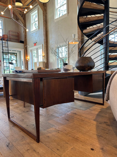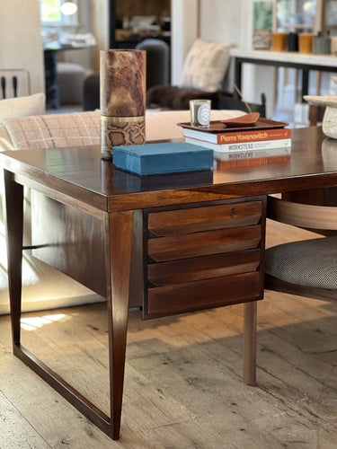 This 1960's Desk by Kai Kristiansen in Rosewood is a perfect blend of functionality and style. Crafted from high-quality walnut, this desk offers a sleek and timeless design. Its spacious surface and drawers provide ample storage space for all your work essentials. Transform your workspace with this stunning piece.