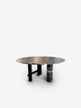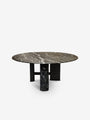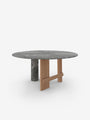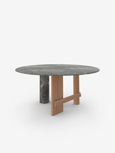 The oval and round table is characterised by a solid wood structure with an oval leg which is connected by one or two crosspieces to the two cylindrical legs. The top is in the same wood essence as the structure or combined with a cylindrical column of strong presence available in a selection of marbles and coloured ceramics.