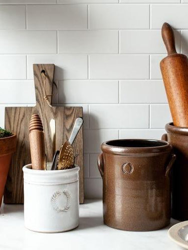 This Agrarian Crock in Toast by Farmhouse Pottery is an artisanal, stoneware vessel perfect for storing kitchen essentials. It's been made and glazed in Vermont and features a timeless design that is both functional and stylish. With its rustic, yet modern look, this crock will fit right in with any kitchen decor.