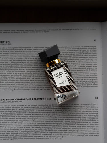 Narcotic Bohemic is a textured, aromatic scent that celebrates hedonistic freedom and nocturnal creativity. Spiced cardamom, clove, and clary sage give way to the powdery elegance of orris and the bitter edge of coffee. The drydown fuses leather, vetiver, and tobacco, evoking vintage books, worn-in jackets, and late-night conversations under dim light.