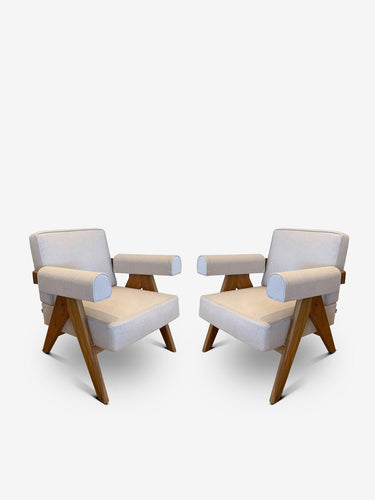 This pair of Pierre Jeanneret 1960 Capitol Complex armchair offers a timeless design in teak wood, upholstered in cenere fabric by Cassina. The strong teakwood structure and elegant design of the armchairs make them a sophisticated addition to any living space.