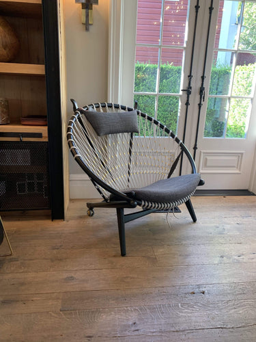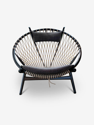 This Hans Wegner Circle Chair features a black frame with brass detailing for a sleek, modern design. The iconic design, crafted by PP Mobler, is a timeless addition to any room. The sturdy frame and superior craftsmanship combine for a chair that can last for generations.