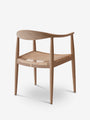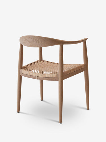 The Hans Wegner Round Chair "The Chair" in Soaped Oak by PP Mobler is a timeless design masterpiece crafted from high-quality materials. Its distinctive curved back and angled legs provide timeless style and unparalleled comfort, making it the perfect addition to any home.