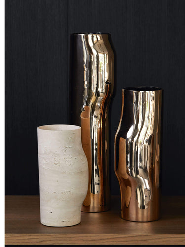 This Christophe Delcourt small BOS vase is expertly crafted from Roman Travertine. Its classic, timeless style will bring elegance to any space, perfect for those who appreciate the beauty of nature. The exquisite material makes it a perfect decorative piece for any home.
