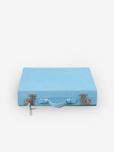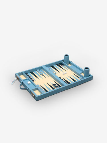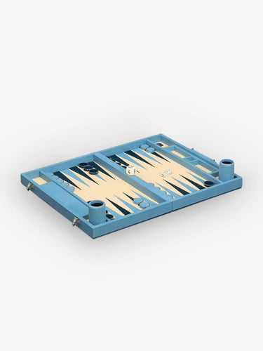 Experience the charming, classic look of the Sky Blue Leather Cafe Backgammon Board by Geoffrey Parker. Crafted from luxurious sky blue leather, this board offers a timeless aesthetic, perfect for any room. Enjoy a classic game with the opportunity to showcase your exquisite style.